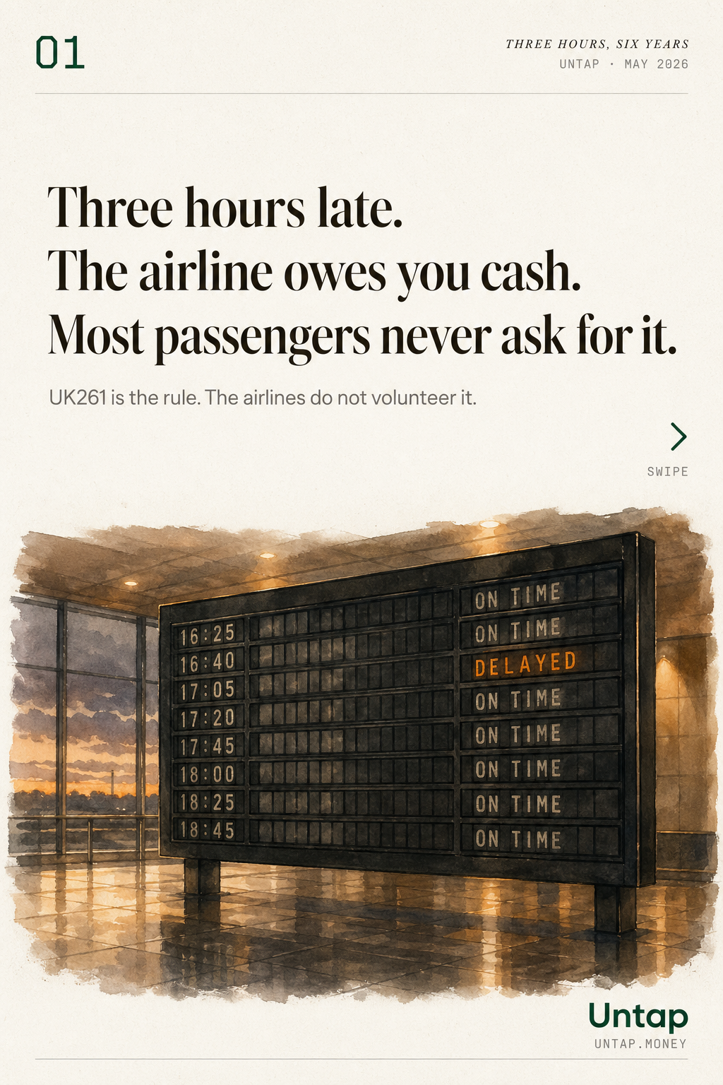Three Hours, Six Years is part of Untap’s research journal. Headline numbers are triangulated from the CAA, the courts, and specialist legal firms; the £1.7 billion annual figure is a derived estimate and labelled as such throughout. Comments and corrections to contact@untap.money.